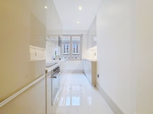 Cuisine contemporaine lumineuse avec mobilier brillant plan blanc et grande baie vitrée