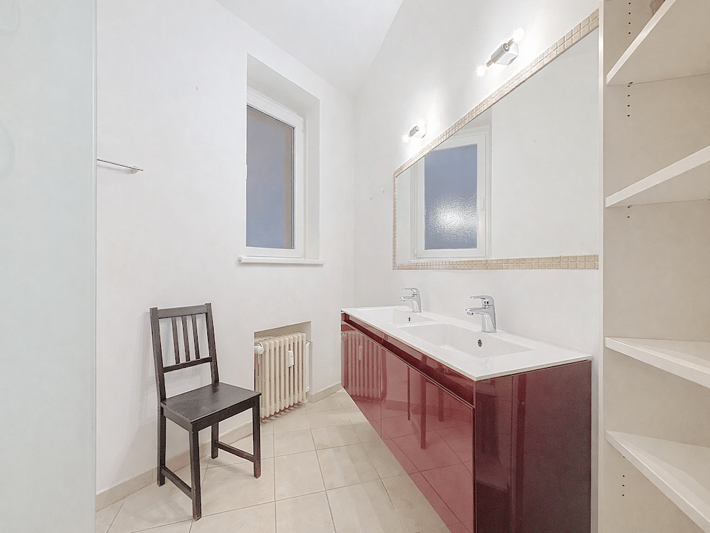 Salle de bain moderne avec mobilier rouge double lavabo grand miroir et luminosité naturelle