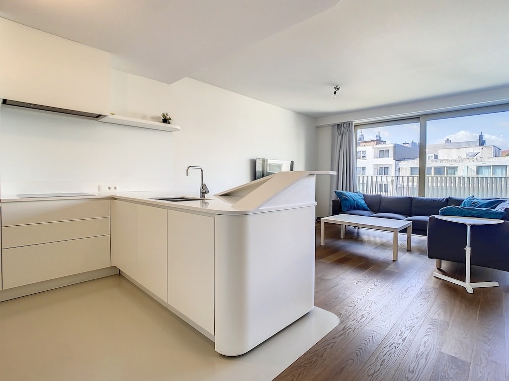 Un salon moderne et lumineux avec une cuisine minimaliste blanche un canapé sombre agrémenté de coussins bleus un tapis clair de grandes fenêtres offrant une vue urbaine et un parquet en bois chaud créant une ambiance chaleureuse et élégante
