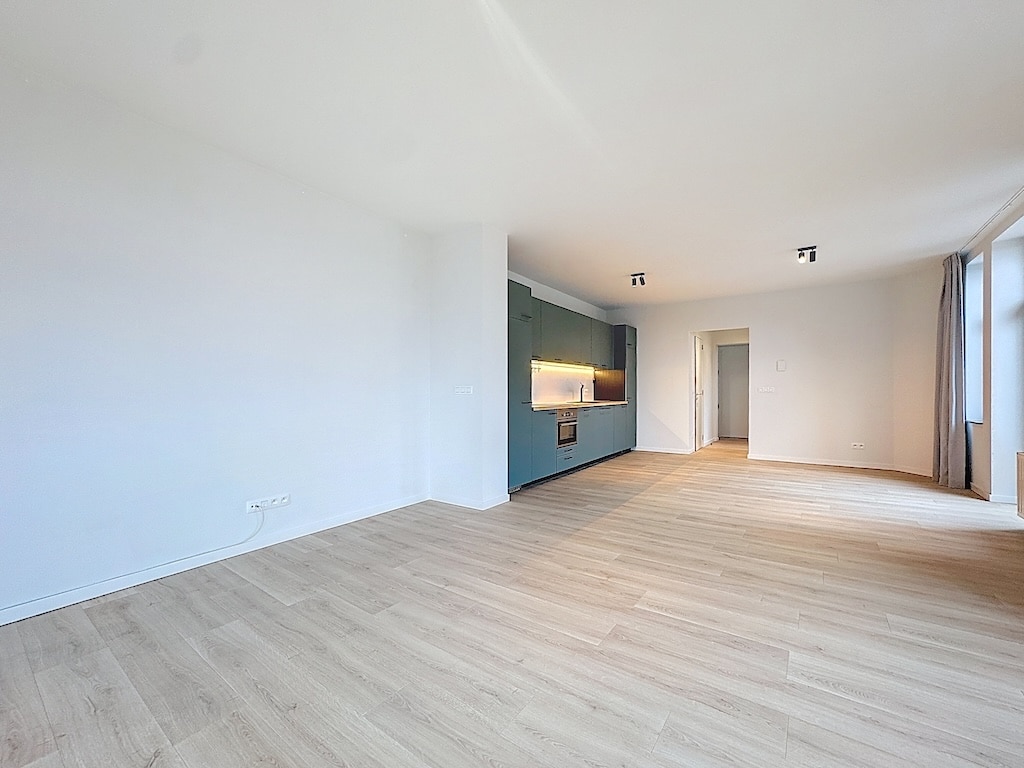 Un intérieur moderne et minimaliste lumineux, avec murs blancs, un mur bleu clair en point focal, un sol en bois clair, et une grande fenêtre laissant entrer la lumière naturelle, créant une ambiance apaisante et épurée.