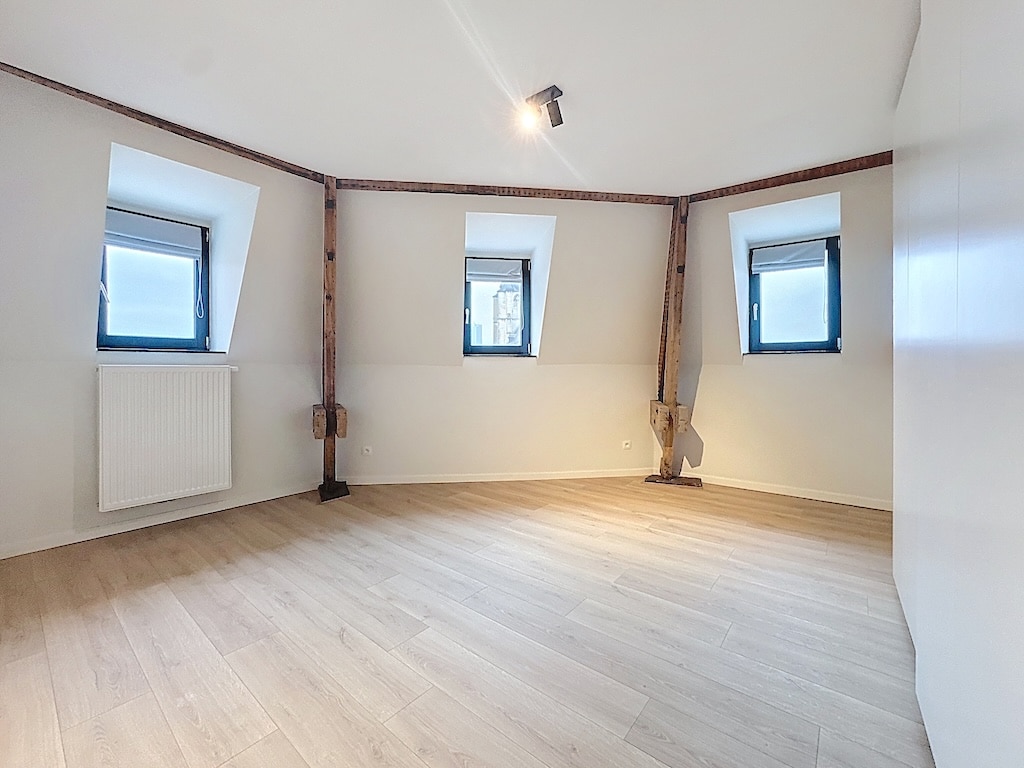 Atelier lumineux en attic avec poutres apparentes design minimaliste idéal studio ou espace créatif