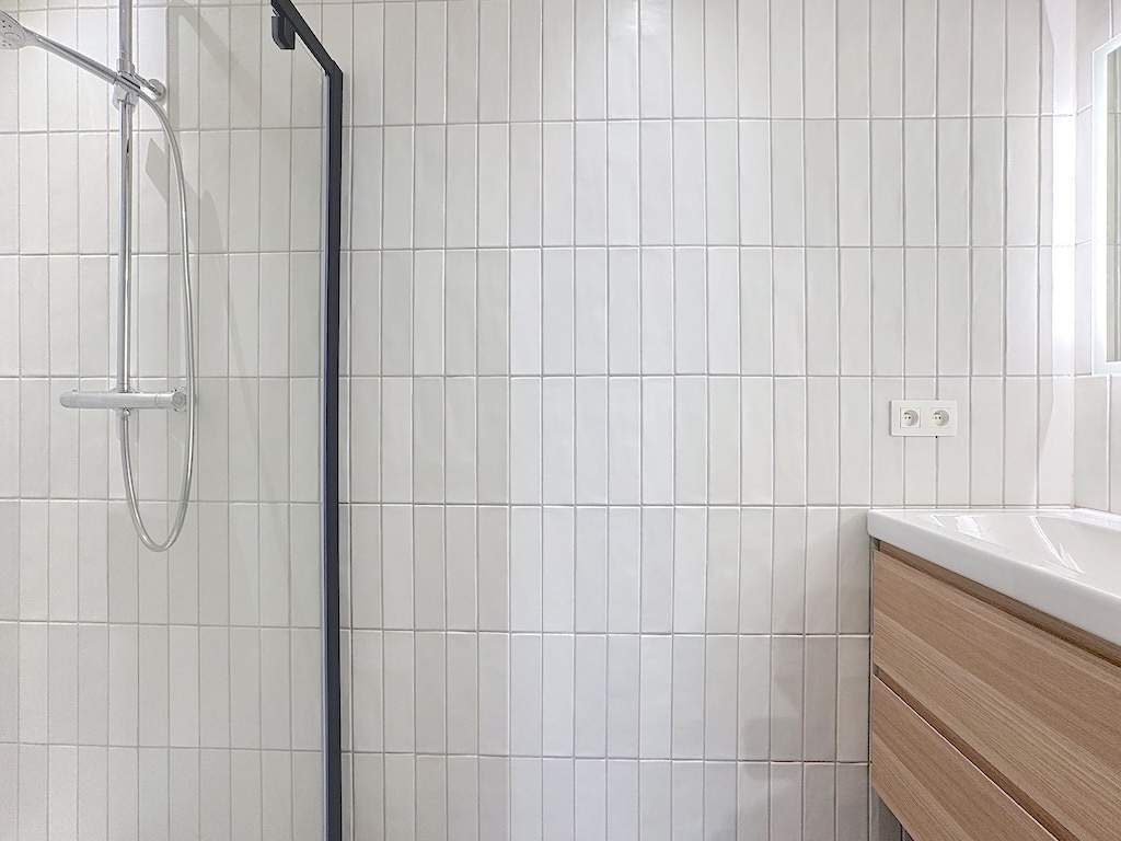 Une salle de bain moderne minimaliste avec murs en carreaux blancs, une cabine de douche en verre avec cadre en métal foncé, un meuble en bois clair avec plans en blanc, et une lumière naturelle apportant luminosité et ambiance zen.