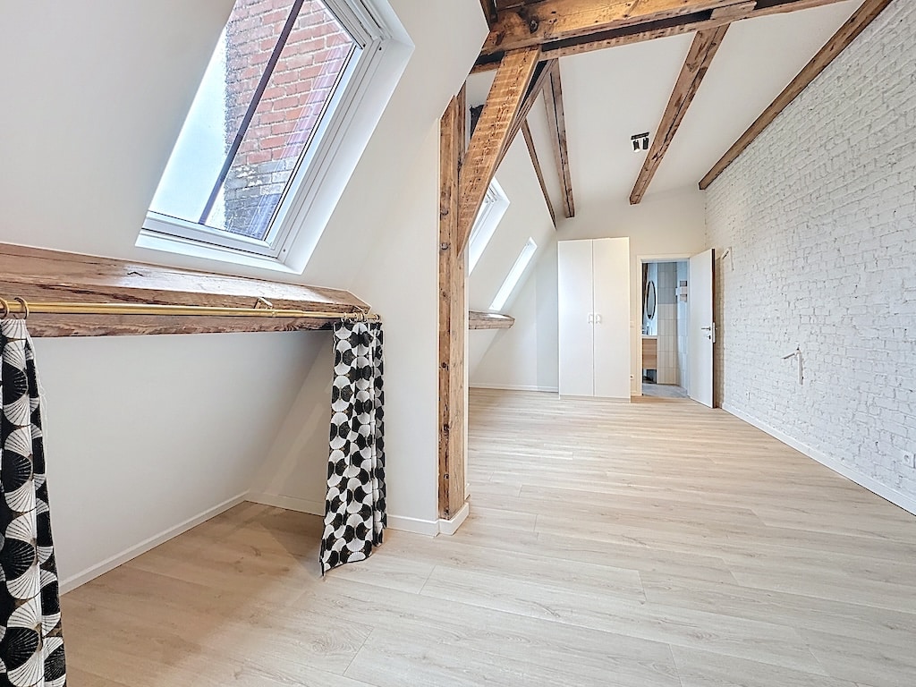 Un intérieur moderne lumineux avec un plafond en pente et poutres en bois apparentes, murs blancs, grande fenêtre laissant entrer la lumière naturelle, mobilier tendance dont un bureau avec une planche en bois et une draperie à motifs géométriques, ambiance chaleureuse et épurée.