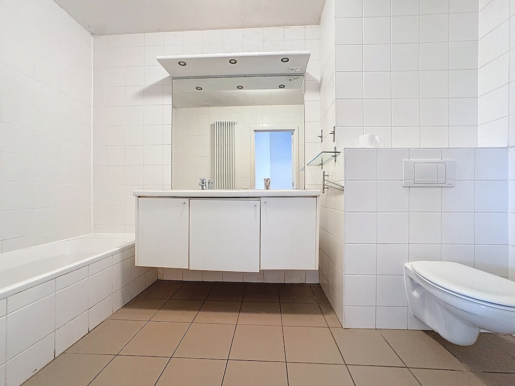 Salle de bain moderne minimaliste avec baignoire meuble miroir et wc suspendu épurée et lumineuse