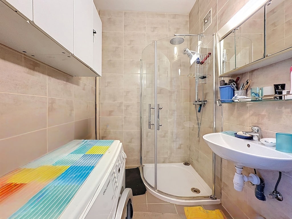 Une salle de bain moderne et compacte avec douche en verre lavabo mural rangements discrets et une machine à laver partiellement couverte dun système coloré le tout dans une palette neutre accentuée de touches colorées