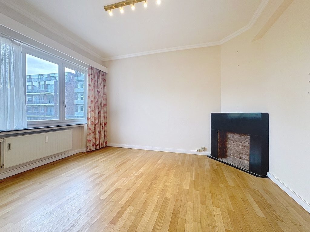 Un salon lumineux et spacieux avec un sol en bois clair, de grandes fenêtres avec voilages satinés, une cheminée moderne noire et un mur neutre, créant un espace sobre, élégant et idéal pour personnaliser son intérieur.