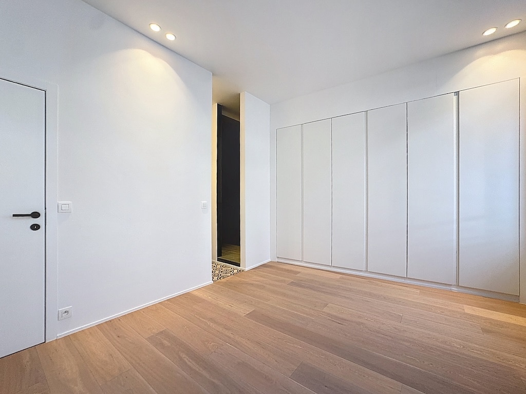 Intérieur moderne et lumineux avec murs blancs sol en bois et rangement minimaliste élégamment intégré