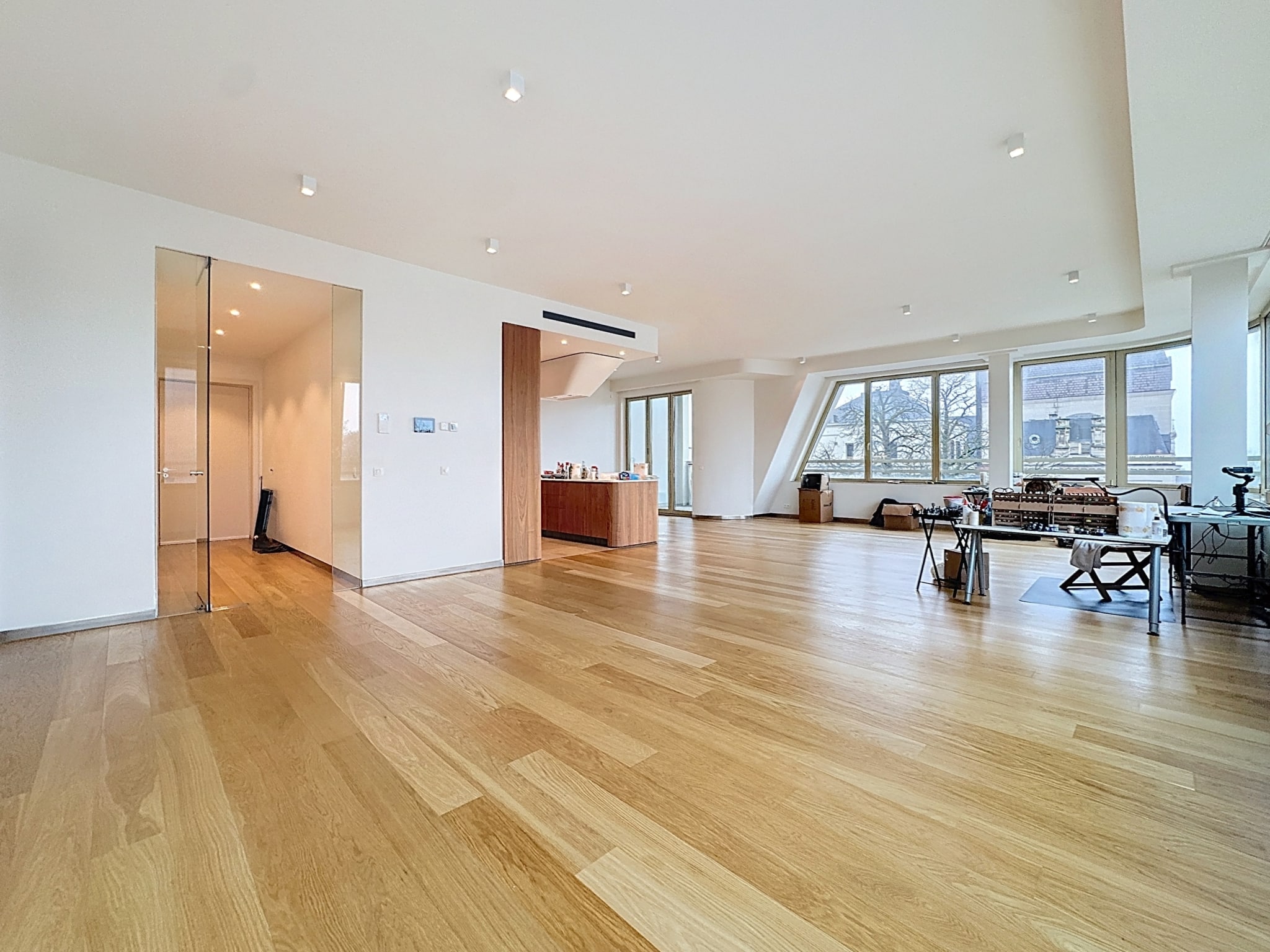 Un intérieur moderne et lumineux avec de vastes fenêtres offrant une vue panoramique Le sol en bois chaleureux la décoration minimaliste et la lumière naturelle créent un espace convivial élégant et idéal pour se détendre ou recevoir