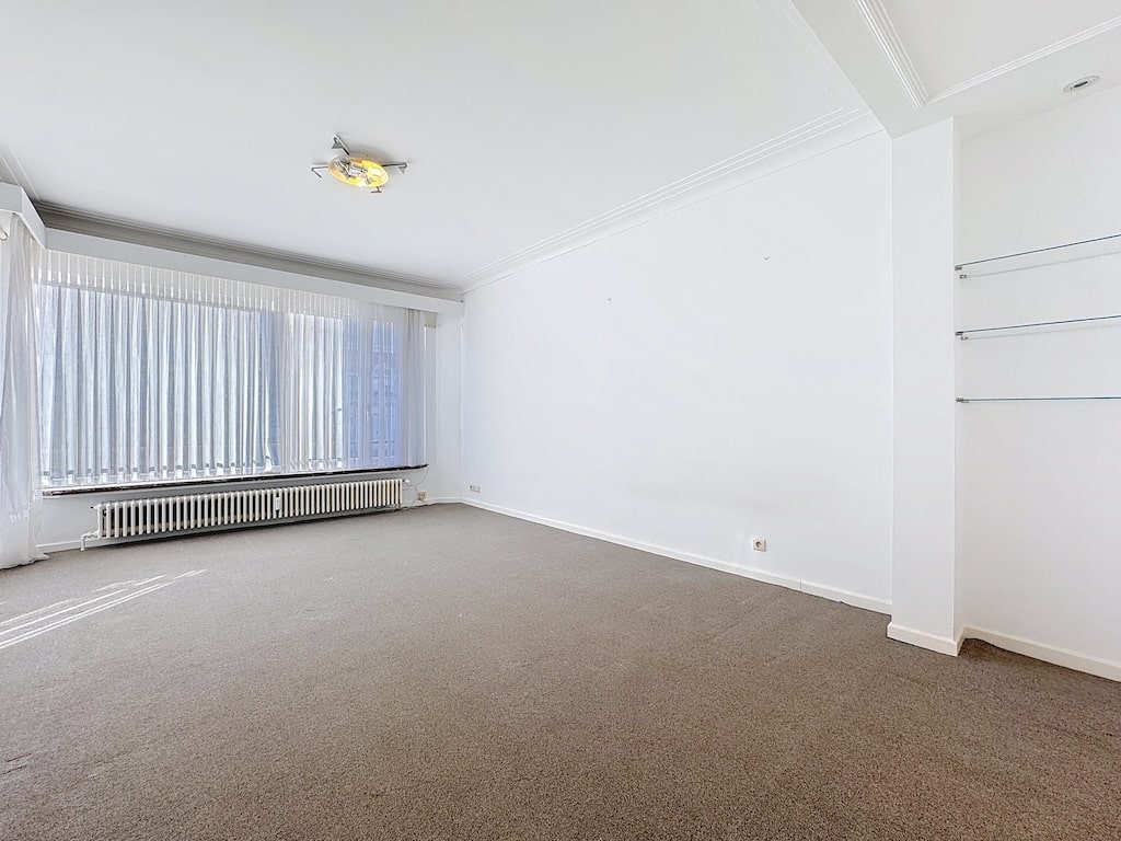 Une pièce lumineuse et minimaliste avec murs blancs un grand fenêtre avec rideaux légers un sol en moquette beige des étagères flottantes sur le mur et un éclairage au plafond offrant un espace versatile prêt à personnaliser