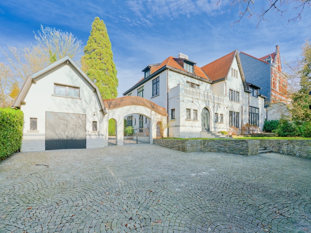 Une villa élégante à uccle alliant styles classique et moderne avec façade en briques et stucco clair toit en tuiles rouges jardins soignés allée en pavés garage séparé avec arc entourée de verdure optimale pour un cadre paisible