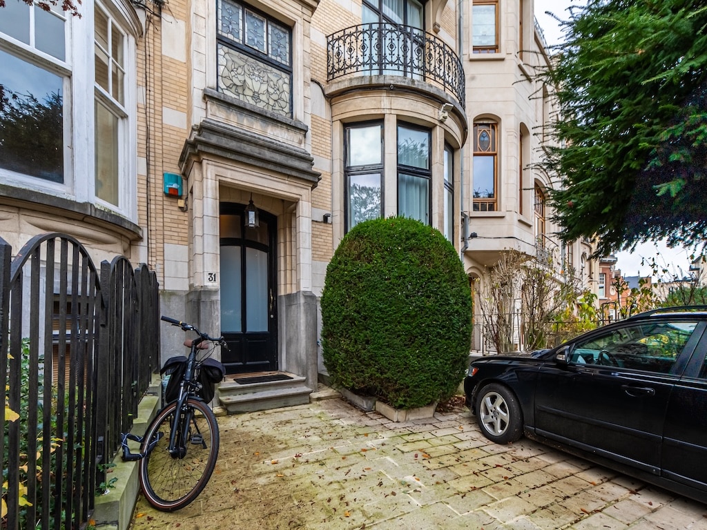 Une façade élégante dune résidence urbaine charmante avec des murs en briques de grandes fenêtres détaillées un balcon supérieur un chemin pavé un buisson arrondi un vélo contre la rampe une voiture noire dans le parking entourée darbres et de verdure apaisante