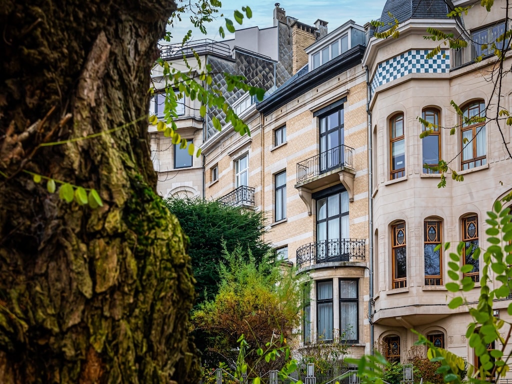 Une charmante façade urbaine mêlant architecture historique aux touches modernes ornée de balcons délicats aux couleurs pastel Un arbre robuste et des feuillages verts encadrent la scène sous un ciel nuageux doux créant une atmosphère paisible et harmonieuse