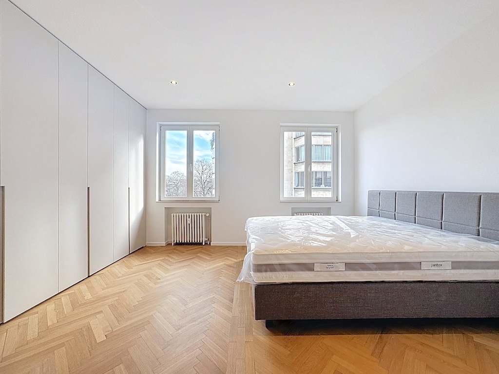 Une chambre moderne et élégante au style minimaliste avec murs pâles grandes fenêtres laissant entrer la lumière naturelle un lit confortable au dossier rembourré gris plancher en chevrons en bois et des placards intégrés blancs pour un espace organisé et apaisant