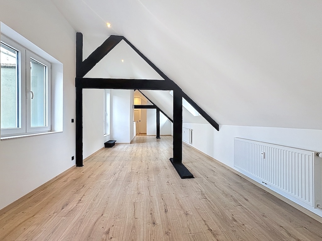 Attique Lumineux avec Poutres Noires et Design Minimaliste