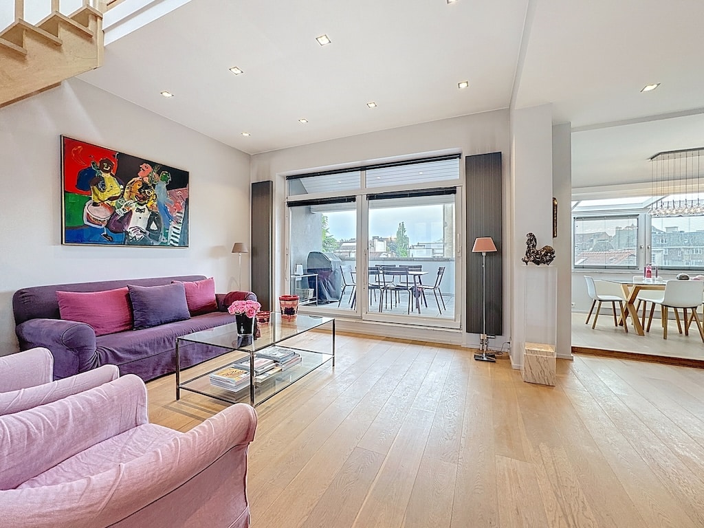 Un salon moderne et coloré avec un canapé violet des coussins roses une œuvre dart vive de grandes fenêtres laissant entrer la lumière naturelle un tapis chaud une table en verre et un coin cosy avec une lampe créant une ambiance chaleureuse et élégante