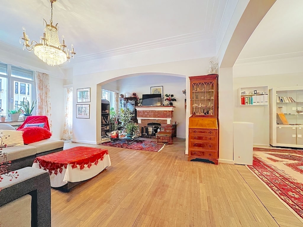 Un salon chaleureux et lumineux, combinant style moderne et traditionnel, avec un canapé gris, coussins rouges, cheminée en bois, tapis accueillant, et une décoration élégante, idéal pour la détente ou recevoir des invités.