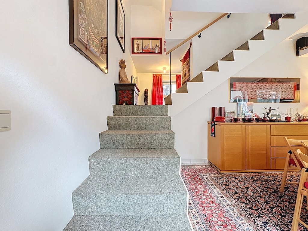 Intérieur chaleureux et élégant avec escalier en pierre claire menant à un espace lumineux décor mixte moderne et rustique tapis de style complexe œuvres dart mobilier en bois poli ambiance conviviale parfaite pour la socialisation