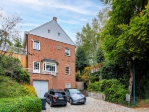 Maison en brique rouge avec jardin verdoyant parking balcon dans un quartier résidentiel paisible