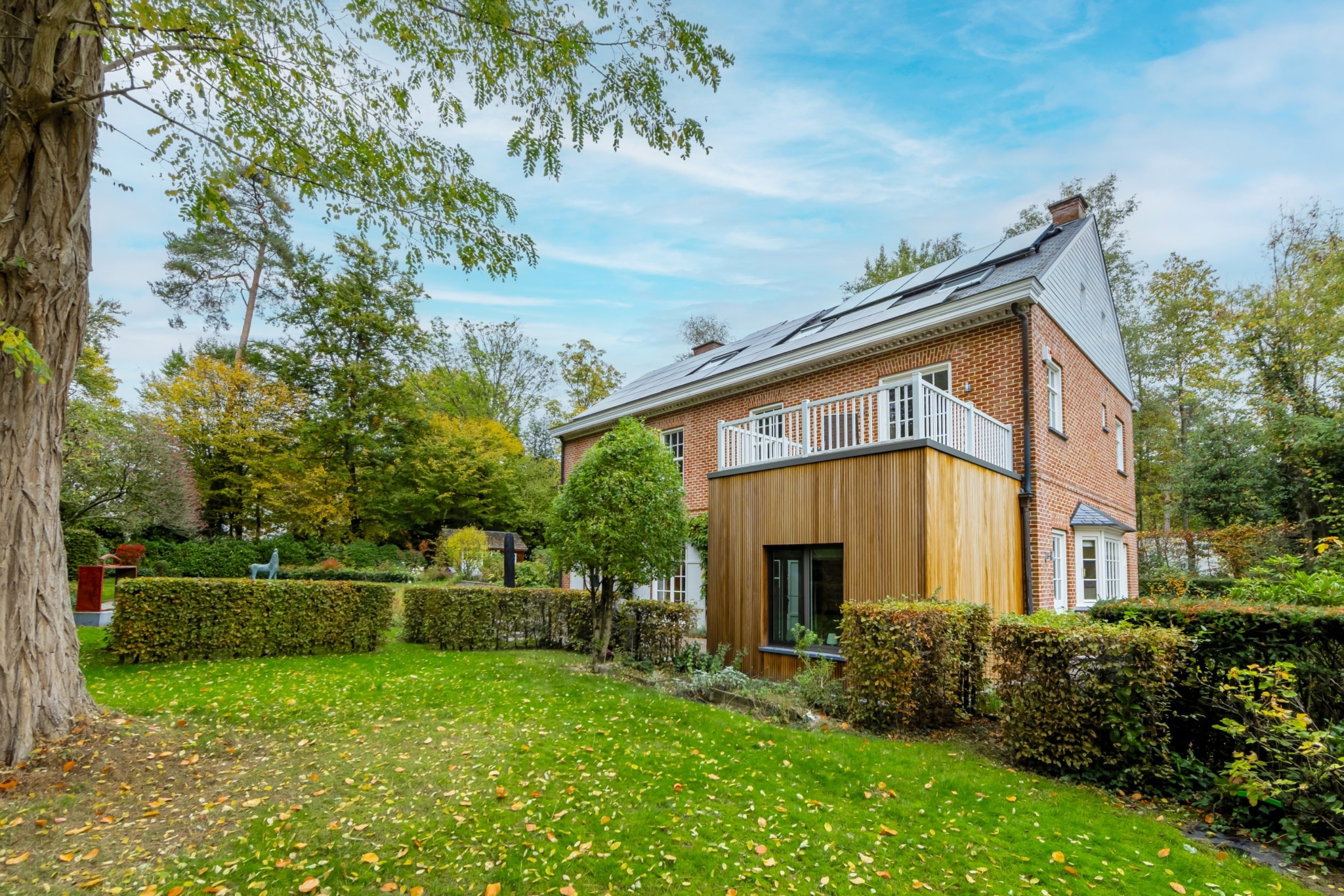Une maison moderne et écologique avec un extérieur en brique rouge une extension en bois panneaux solaires sur le toit entourée dun jardin verdoyant avec arbres et pelouse automnale offrant un cadre paisible et naturel