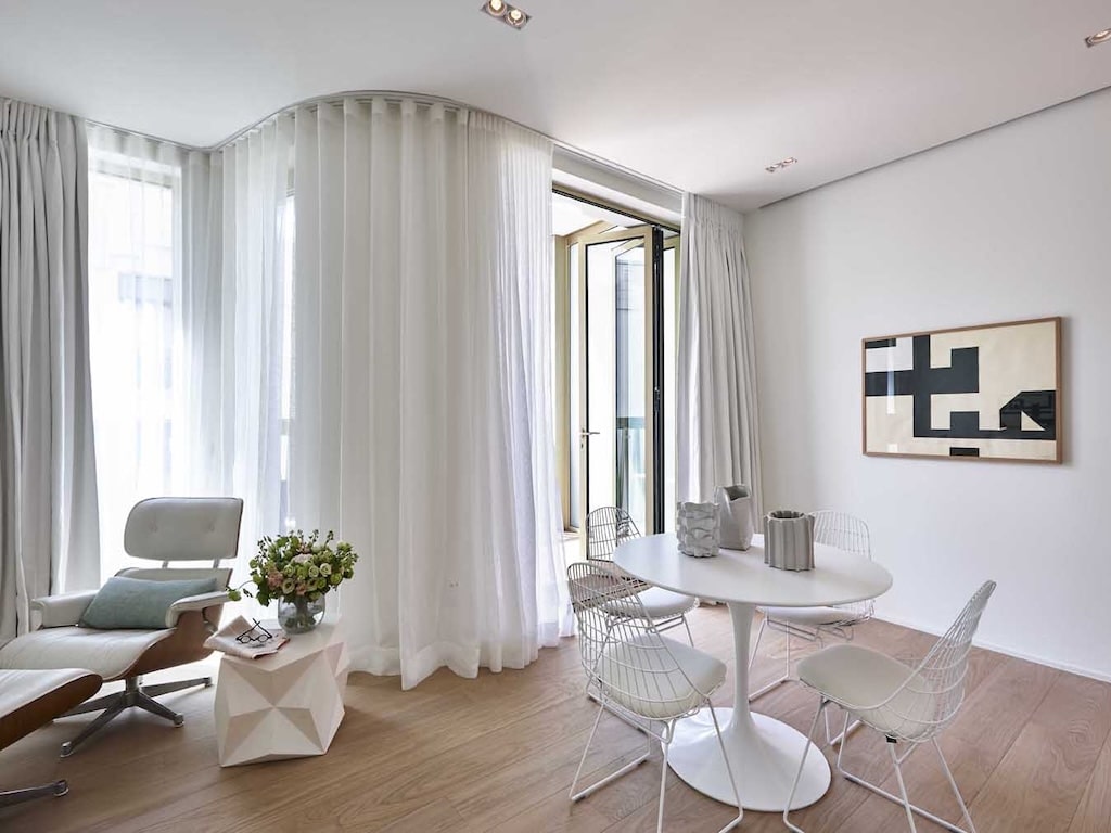 Un salon moderne et minimaliste avec mobilier épuré grandes fenêtres en sheer blanc laissant entrer la lumière naturelle meubles en bois clair une œuvre dart abstraite en accent sur le mur et une table ronde élégante avec des chaises blanches créant une ambiance accueillante et sophistiquée
