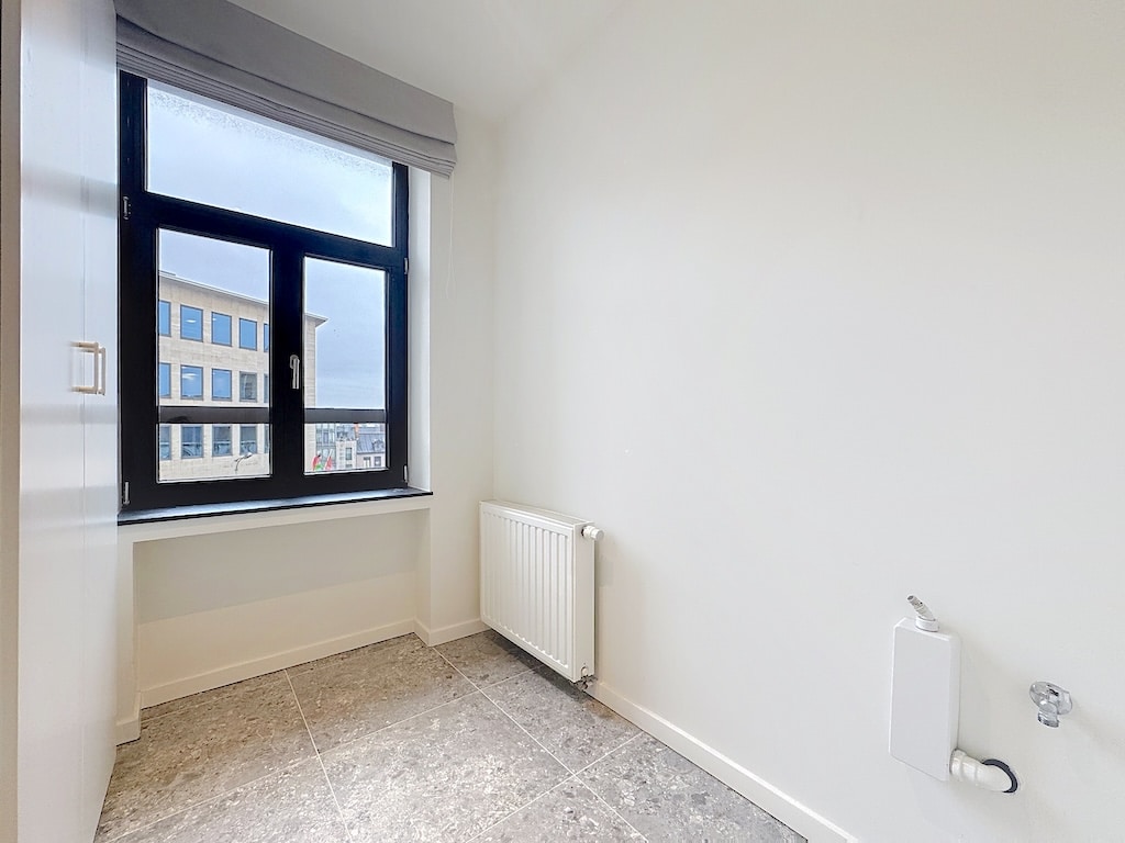 Studio moderne lumineux avec vue urbaine, blanc épuré, grande fenêtre laissant entrer beaucoup de lumière naturelle, radiateur discret en dessous, sol clair en carrelage, et coin avec un petit équipement de plomberie, parfait pour un espace polyvalent.
