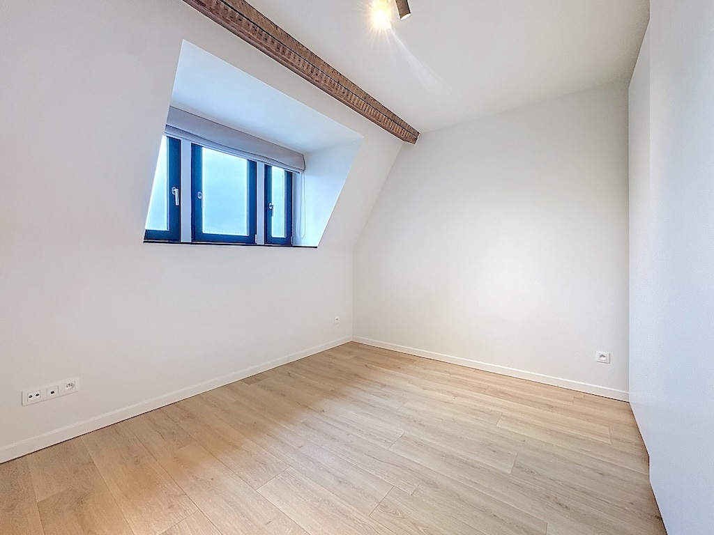 Une pièce lumineuse au design minimaliste avec murs blancs plancher en bois clair fenêtres rectangulaires et poutre en bois apparente offrant un espace épuré et versatile idéal pour la détente ou la création