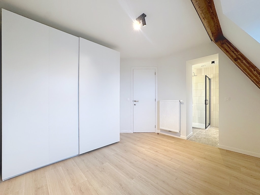 Interior moderne et lumineux avec murs blancs plafond à poutres en bois grand placard blanc minimaliste sol en bois clair porte coulissante chaudière radiateur et vue sur une salle de bains côté arrière offrant un espace chaleureux et épuré